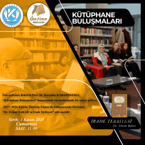 Üniversitemiz Rektörü Prof. Dr. Kurtuluş KARAMUSTAFA, Kütüphane Buluşmaları kapsamında öğrencilerimizle buluşuyor. Kasım ayı buluşmamız merkez kampüsümüzde bulunan Mehmet Akif Ersoy Kütüphanesi’nde gerçekleşecektir. Bu ayki kitabımız: “Dr. Ethem BAKAR’ın İrade Terbiyesi” adlı eseridir